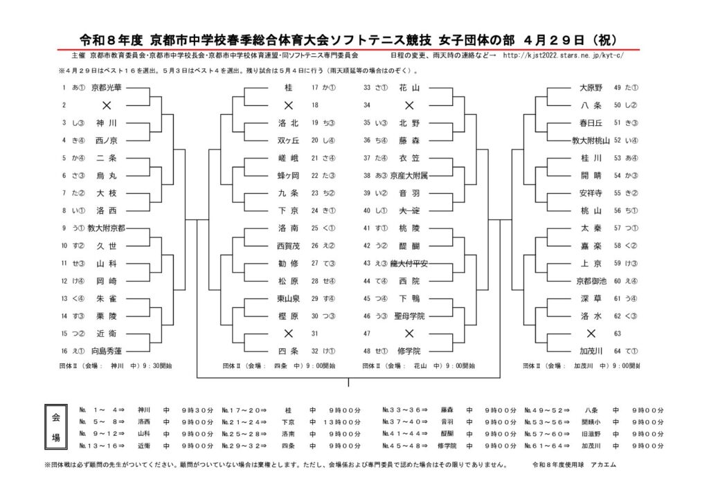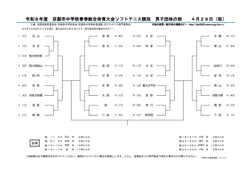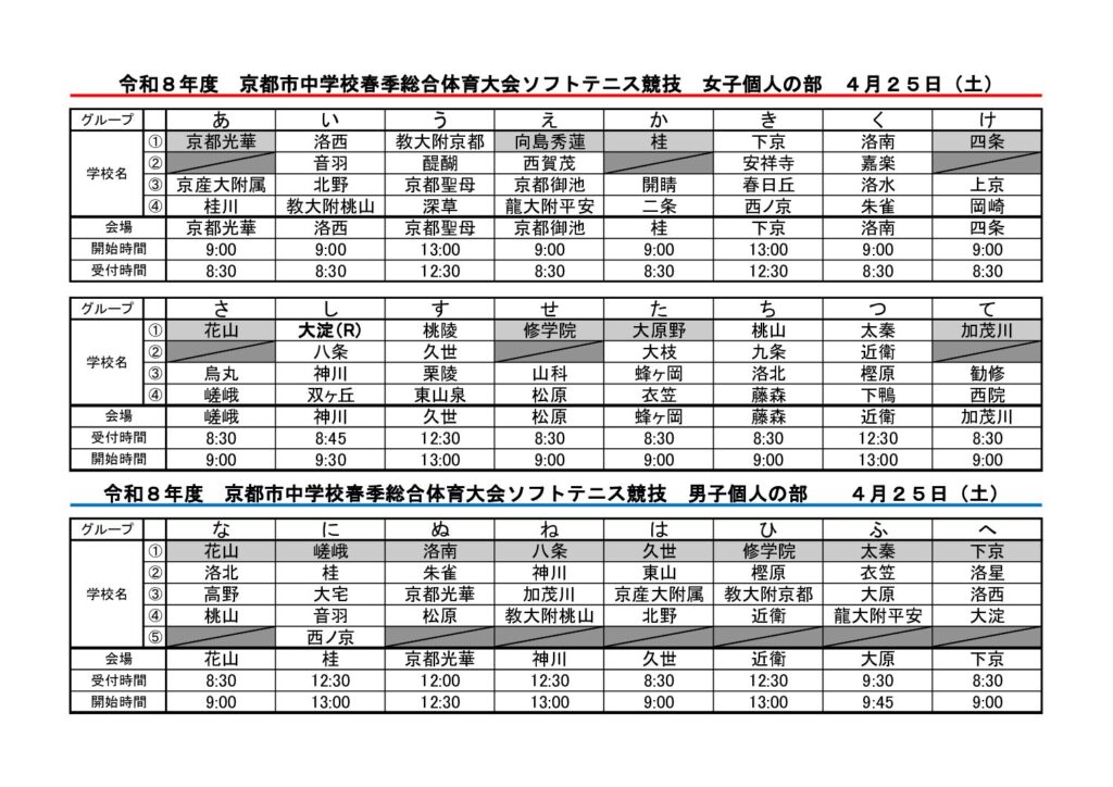 令和8年度春季総体個人戦・団体戦の組合せ 2026-04-202026-04-20 先週13日(月)に四条中学校にて顧問総会および抽選会を行いました。 抽選結果は以下の通りです。 ※個人戦当日(4月25日または26日)に、受付でエントリーを提出し顧問打ち合わせの際に【A~D】の抽選をし、対戦相手を決定します。 6 total views, 0 views today
